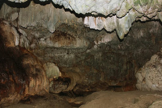 Wah, maha karya yang agung, Seberkas cahaya menyusup dari balik-balik ranting yang bergantungan di luar gua. Menembus masuk ke dalam dan tampaklah coretan warna putih kuning, coklat muda, coklat kehitaman dan hitam yang membekas melumuri dinding-dinding gua. Basah, air mengalun di tiap lekukan gua.