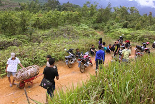 Siap, ayo dorong. Liatnya tanah yang berlumpur menahan ban kendaraan kami hingga berulang kali terjebak di dalam lumpur. Tak sekali, trek seperti ini berulang kali dijumpai hingga tiba di tujuan utama. Begitu melelahkan. Turun dari kendaraan dan harus membantu mengangkat kendaraan rekan lain yang terjebak di dalam kubangan. Namun, rasa kebersamaan serta indahnya alam membuat rasa lelah itu terabaikan